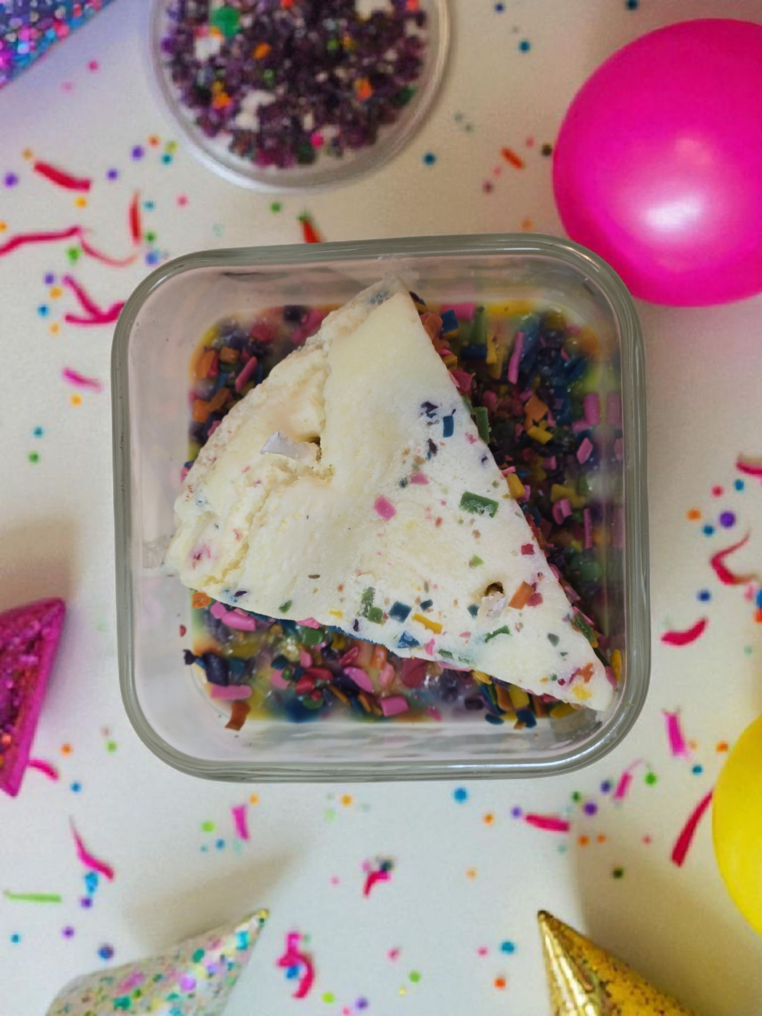 The blend of confetti, cake slice, and birthday cake scent aims to create a celebratory and mouthwatering atmosphere, inviting you to make a wish as the flame dances.