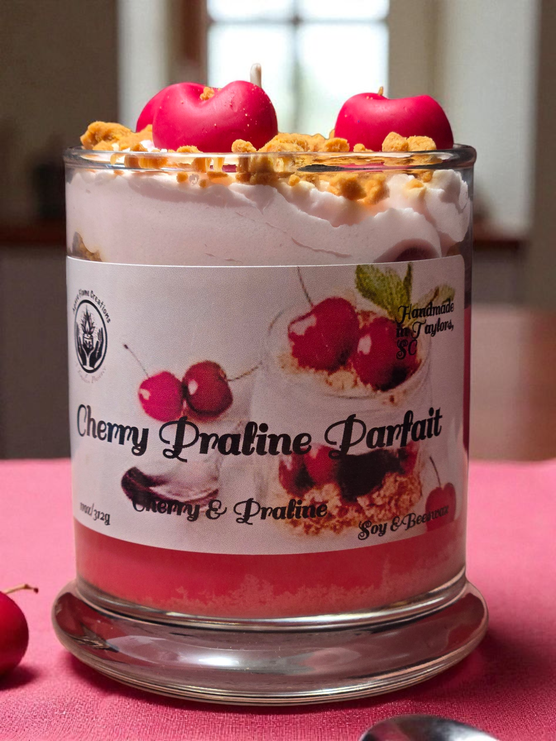 Experience the rich scent of a freshly baked cherry praline dessert in this elegant candle. Its carefully crafted design resembles a gourmet pastry, enhancing the sensory appeal. The fragrance opens with vibrant, juicy cherries offering a perfect balance of sweetness and tartness. At its heart lies a warm praline blend with toasted pecans, buttery brown sugar, and deep vanilla notes. A smooth base of creamy vanilla and amber complements and elevates the dessert-like sweetness.