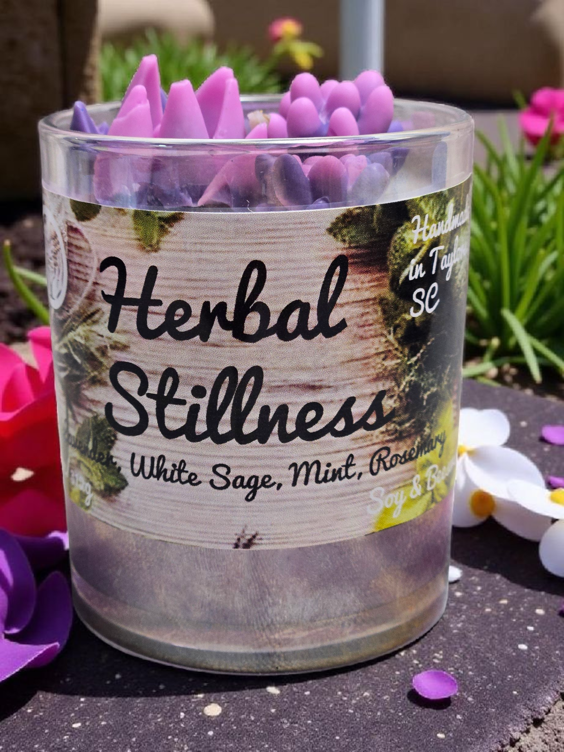 Experience tranquility with the Herbal Stillness 7oz candle, crafted from white sage, mint, and rosemary. Its soothing aroma promotes calm and relaxation, making it an ideal addition to spa environments or serene spaces at home. Topped with delicate purple and pink succulents, this candle combines natural beauty with expert-crafted fragrance to elevate your ambiance effortlessly.