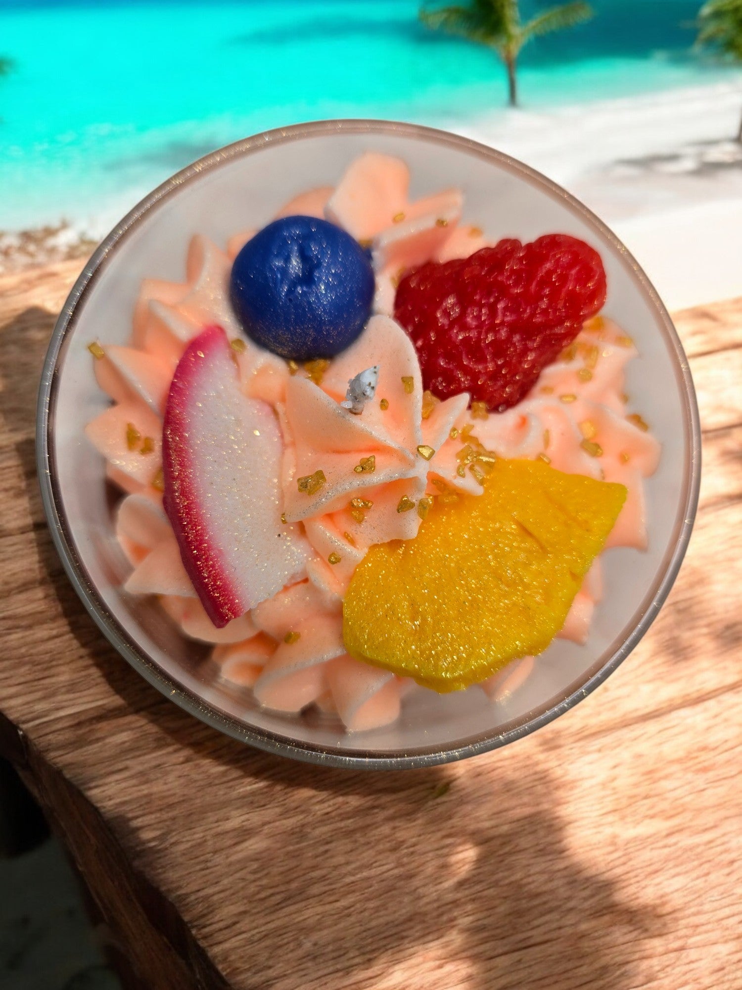 This candle is a true sensory experience. Its warm peachy-orange color, the inviting texture of the whipped wax, the charming fruit embeds, and the intoxicating tropical fruit and berry scent all combine to create a candle that is both a beautiful decorative piece and an instant mood enhancer. It's the perfect choice for bringing a burst of sunshine and the feeling of a tropical getaway into any room.